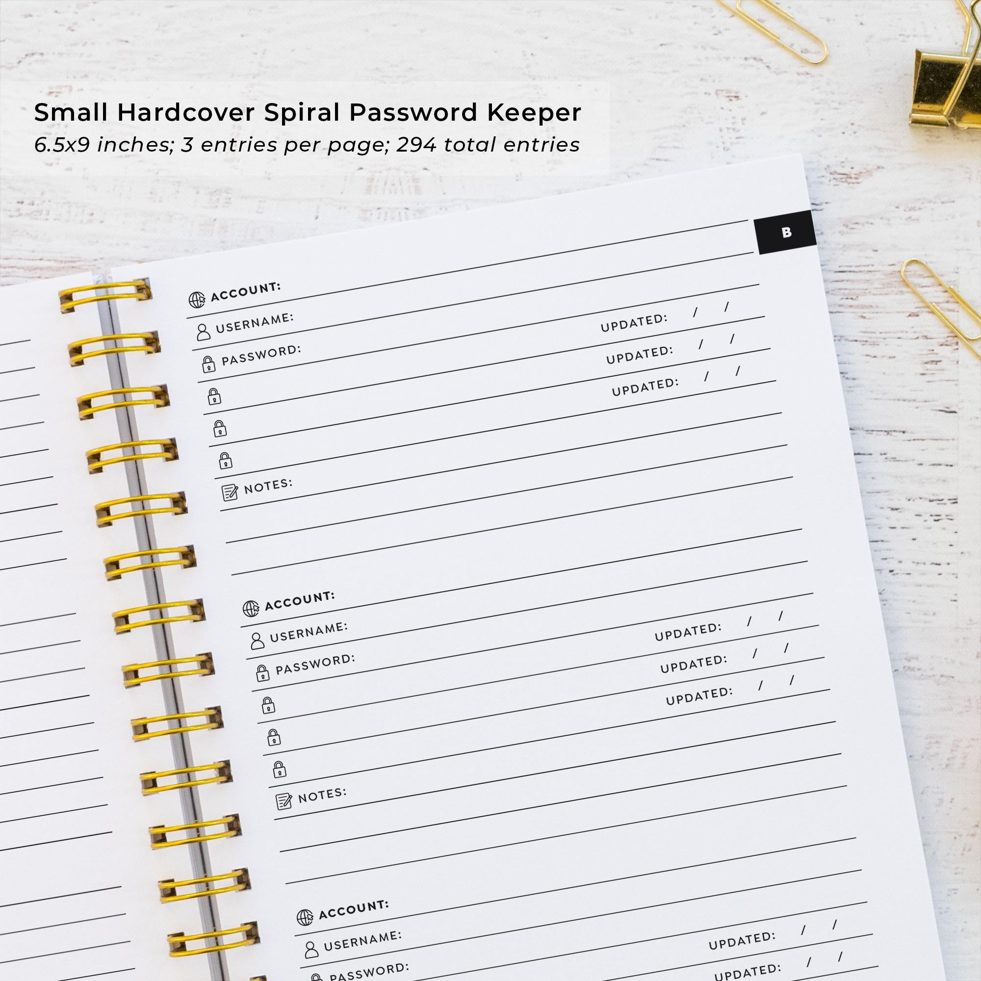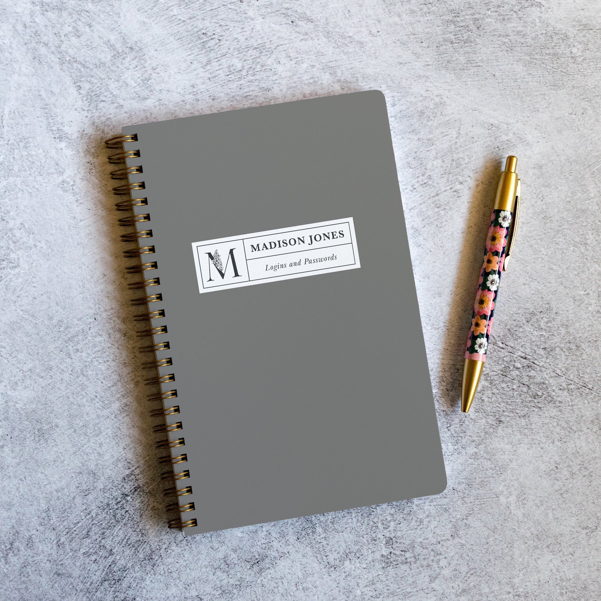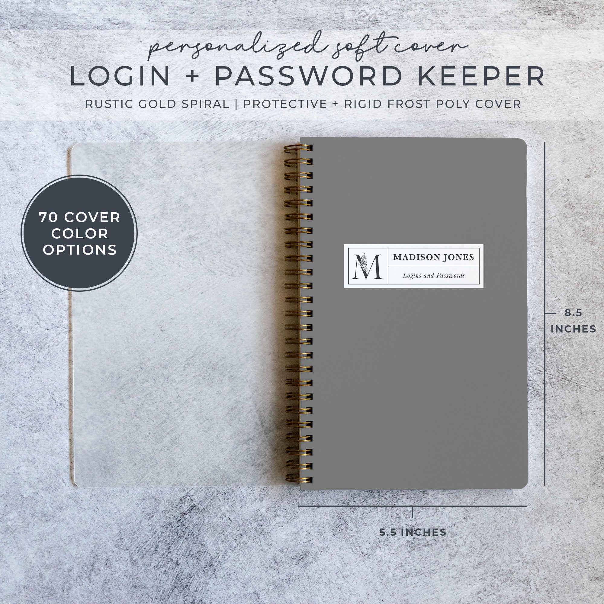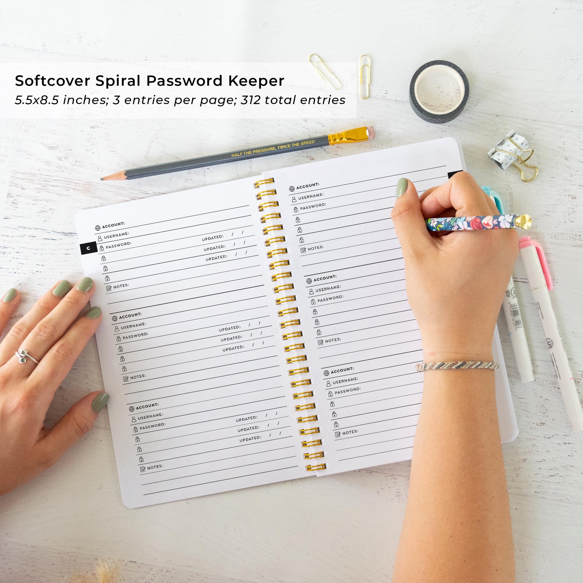 This chic, minimalist password book is a simple, easy way of keeping track of all your logins and passwords. With three convenient sizes, it's great on your desk or on the go. Includes luxe 70# interior sheets and a personalized custom-printed cover in your choice of 70 colors. The softcover spiral book is 5.5x8.5 inches and accommodates 312 entries; the small hardcover 6.5x9 inch book accommodates 252 address entries, and the large 8.5x11 hardcover book holds 672 entries. Personalize the front cover with your name and/or other text. Makes a fun and practical personalized gift for friends, roommates, family and more!